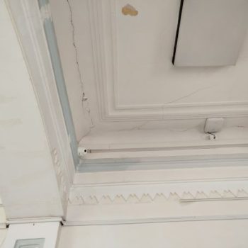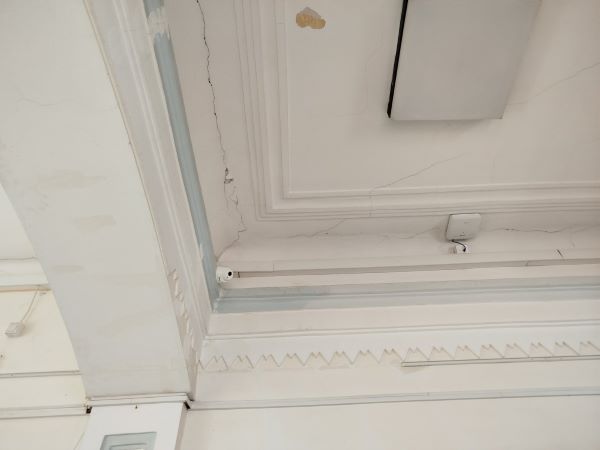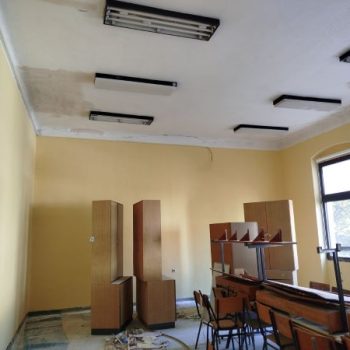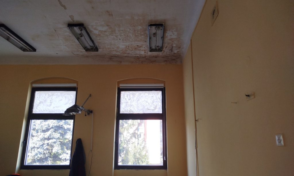 Na spratu za koji još nije ni završena javna nabavka za najvažnije radove: onaj karatavan i rupe kroz koje se sliva voda na plafone. Plafoni još izraženije flekavi u odnosu na sada svežu boju zidova.