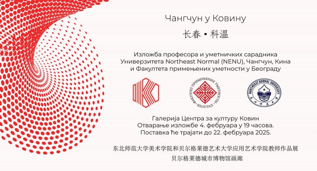 03. 02. 2025. – Izložba radova nastavnika i saradnika „Northeast Normal“ (NENU) iz kineskog grada Čangčun i Fakulteta primenjenih umetnosti u Beogradu pod nazivom „Čangčun u Kovinu“ biće svečano otvorena u utorak, 04. februara u 19:00 časova u galeriji Centra za kulturu Kovin.