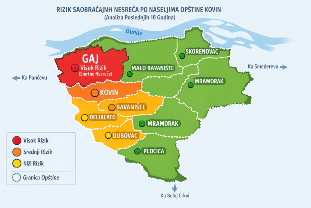 Prema raspoloživim podacima koji se mogu naći na internetu, ne postoje precizno definisane, a javno dostupne, kritične tačke za područje opštine Kovin, ali su sasvim sigurno putni pravci Gaj-Dubovac i Kovin-Pančevo među najčešće pominjanim u saobraćajnim nezgodama.