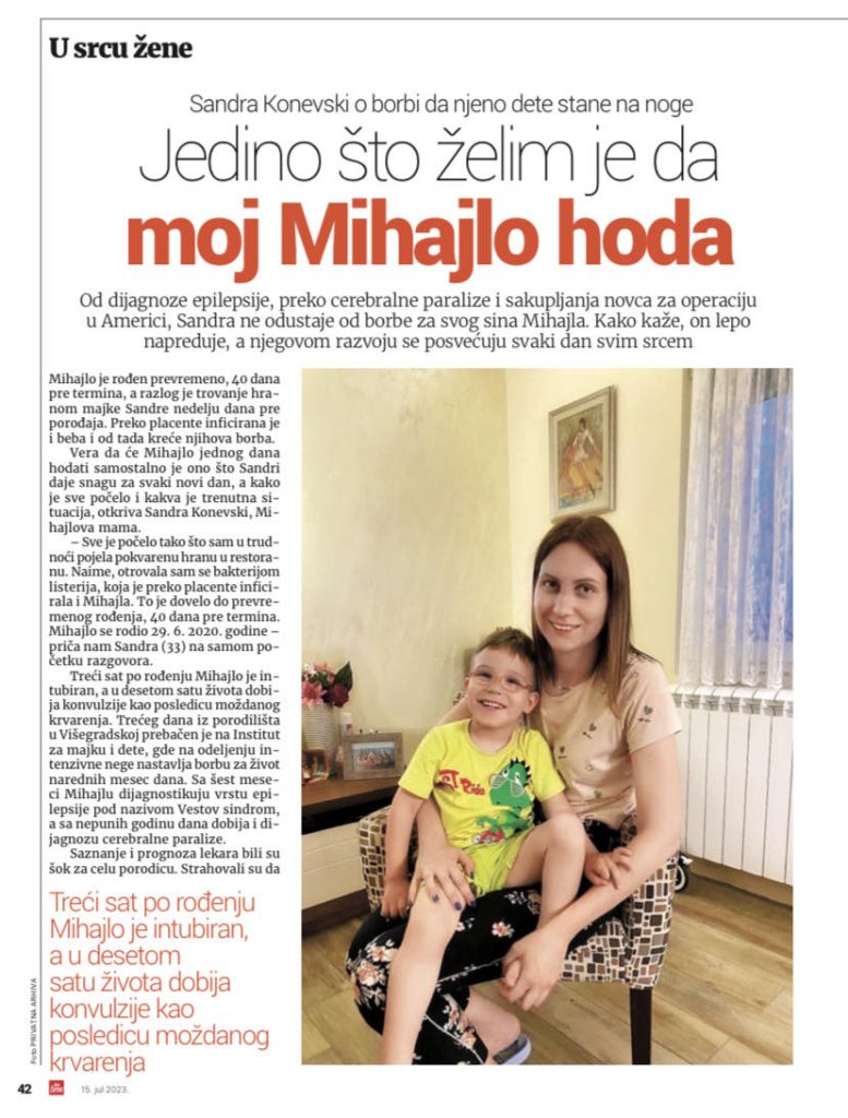 „Mihajlo je imao operaciju, selektivno dorzalnu rizotomiju, u Americi u oktobru. Sve je proslo u najbolje redu. Preporuka doktora Parka I njegovih fizioterapeuta je da sada ima intezivne fizikalne terapije kako bi operacija imala efekta I da bi on prohodao sam. Za sada hoda uz pomoc hodalice koju je dobio tamo, a za duže staze koristimo ortopedska kolica . Intezivne fizikalne terapije podrazumeva pet puta nedeljno odlazak na vezbe, kao I terapijsko jahanje konja (hipoterapija) I plivanje. Za sve ove tretmane nam je potrebno puno novca na mesecnom nivou, jer je veoma vazno da ima kontinuitet, kako bi imalo efekta. Molimo sve ljude, dobre volje da nam pomognu u nasoj borbi da Mihajlo sto pre nacin samostalne korake“- kaže se u apelu koji nam je poslao Dušan Milojkov.