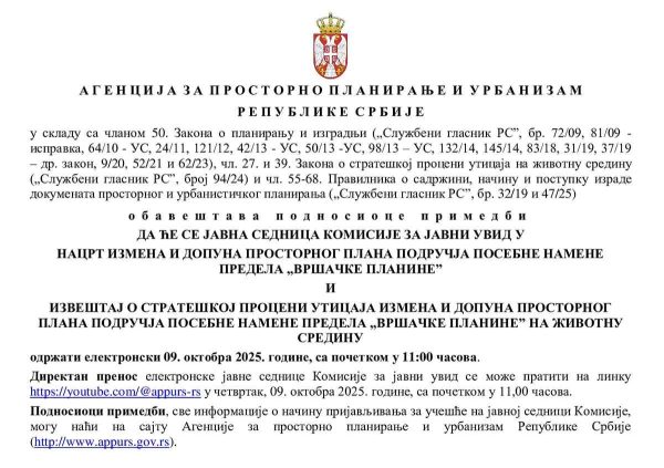 Samo građani i pravna lica koja su podnela primedbe na nacrt PPPPN „Vršačke planine“ mogu da se prijave na e-mail: ju.vrsackeplanine@appurs.gov.rs najkasnije do ponedeljka 6. oktobra do 15:00 časova. Pre početka sednice prijavljeni dobijaju link.