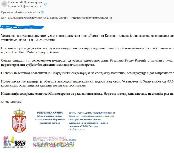 Pokrajinska inspekcija je obavila vanredni inspekcijski nadzor nad ovom Ustanovom i Zapisnikom od 05.08.2025. godine konstatovala da u objektu na adresi Ive Lole Ribara br. 8, Kovin nisu zatečeni korisnici, osim lica na administrativnim poslovima.