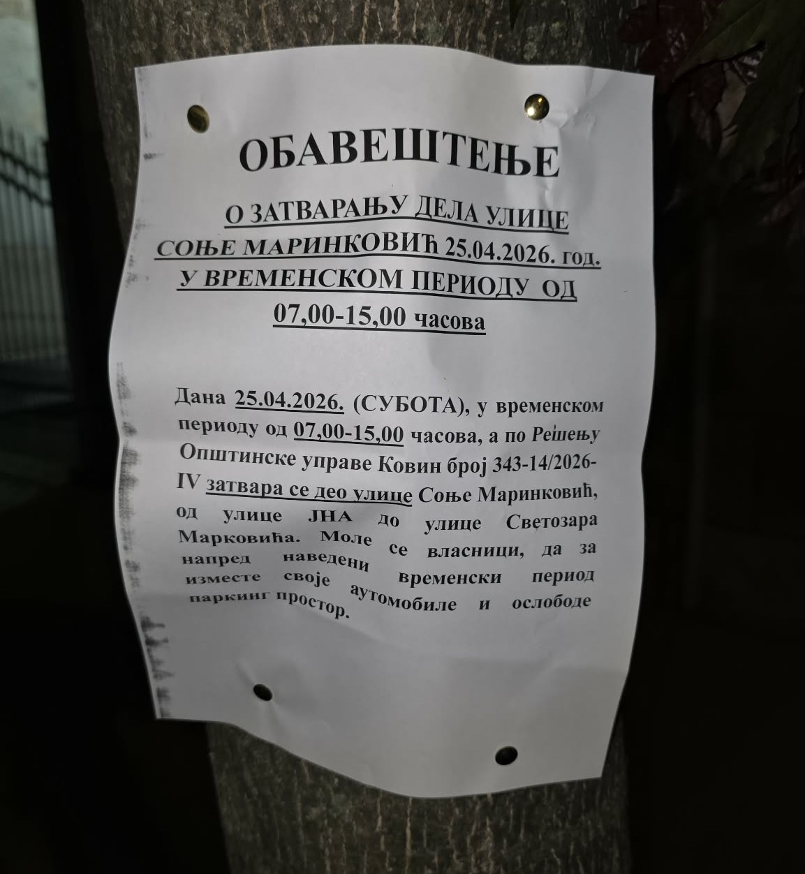 Opštinska uprava na čijem je čelu načelnica Jelena Čolaković izdala je rešenje o zatvaranju ulice Sonje Marinković, od ulice JNA do Svetozara Markovića, u subotu, 25. aprila, od 07 do 15 sati. Na osam punih sati. Istovremeno je zamoljeno da se sva vozila uklone sa parkinga i iz ulice kako bi ulica ostala slobodna.
