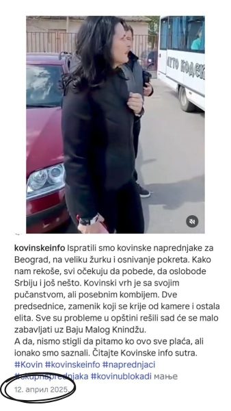 Tog 12. aprila kada su dva aktiva žena tobože išla na izlet o trošku Turističke, članovi i simpatizeri SNS iz opštine Kovin snimani su kako kreću za Beograd i u izjavama nam rekli da očekuju slobodu, da bude bolje, da sve dobro prođe. Ne znamo koliko su koštali svi ti autobusi za one koji su išli na skup i odakle su plaćeni, ali utvrdili smo da je preko računa TOOK Kovin prevozniku Markoviću plaćeno 39.600 za dva vozila od po 18 sedišta. U obrazloženju za prenos sredstava stoji da TOOK organizuje izlet za udruženje žena „Vredne ruke“ iz Kovina i udruženje iz Malog Bavaništa u skladu sa svojim programskim aktivnostima. U programu za 2025. godinu nigde nismo videli da su planirani izleti, jer smisao turističke organizacije nije da odvodi ljude na izlete, već da podstiče goste da dolaze organizovano u opštinu.