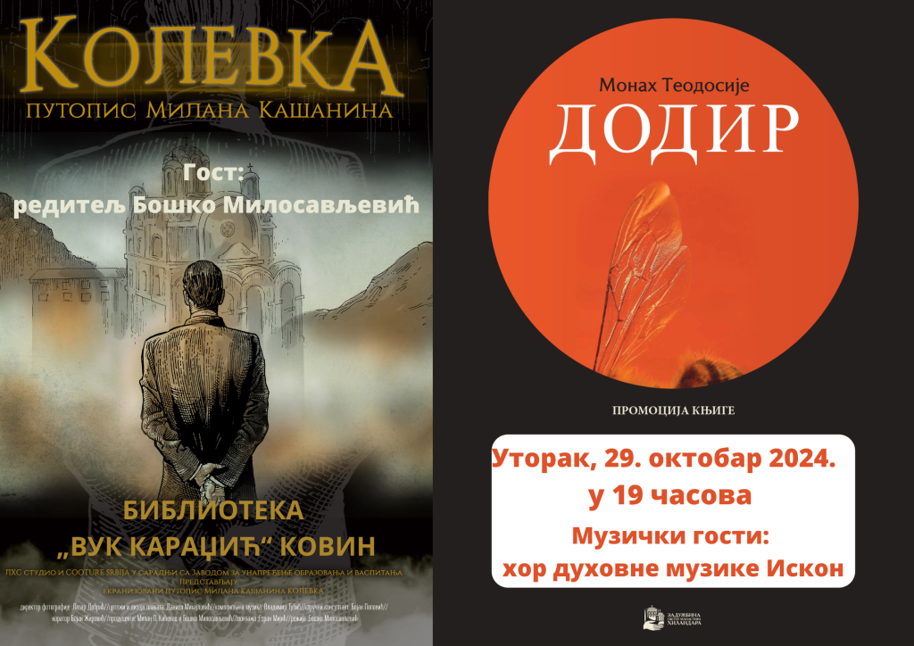 25. 10. 2024. – Biblioteka „Vuk Karadžić“ Kovin poziva čitaoce da prisustvuju umetničkom programu u utorak 29.oktobra u 19:00 časova. Reditelj i profesor Boško Milosavljević predstaviće svoj film „Kolevka putopis Milana Kašanina“ i knjigu monaha Teodosija „Dodir“, a pridružiće mu se i duhovni hor „Iskon“ iz Kovina.