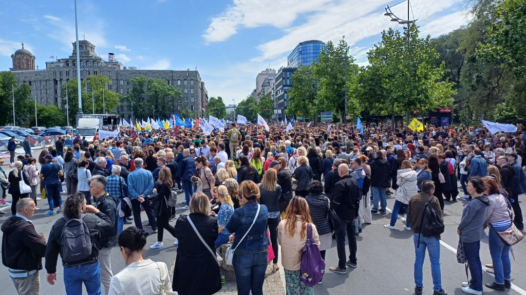 Kako javljaju iz Arhiva javnih skupova na današnjem protestu sindikata prosvetnih radnika zbog prebijanja kolege u Bačkoj Palanci, ispred zgrade Skupštine okupilo se oko 5.500 ljudi. U koloni koja je formirana tokom protestne šetnje brojnost je dodatno povećana, tako da je ukupno u ovom protestu učestvovalo preko 6.000 hiljada ljudi. To je najveći protestni skup zaposlenih u školstvu otkako je na vlasti koalicija SNS i SPS. Na prethodnom protestu koji su organizovali udruženi reprezentativni sindikati prosvete, održanom u septembru prošle godine, bilo je oko 2.500 učesnika.