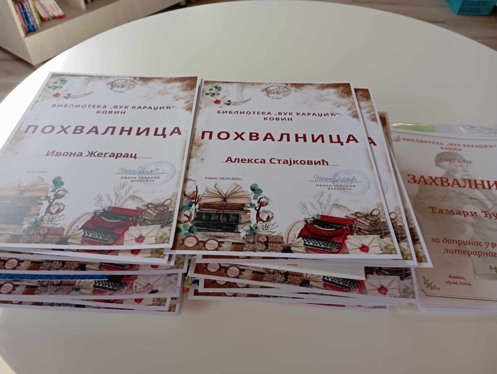 Pohvaljene su sedmakinja i osmakinja iz „Đurine“ škole: Ivona Žegarac i Nađa Rnić za rad „Zašto (ne)želim da porastem“ i Marko Pavlović učenik 5. razreda iz Dubovačke škole za istu temu. Radovi nagrađenih i pohvaljenih učenika izloženi su na panoima u kovinskoj biblioteci. Posebnu zahvalnost izražavamo profesorima razredne nastave kao i profesorima srpskog jezika koji su svojim radom podstakli svoje učenike da pišu, da maštaju i da na taj način obogate i sebe i nas.
