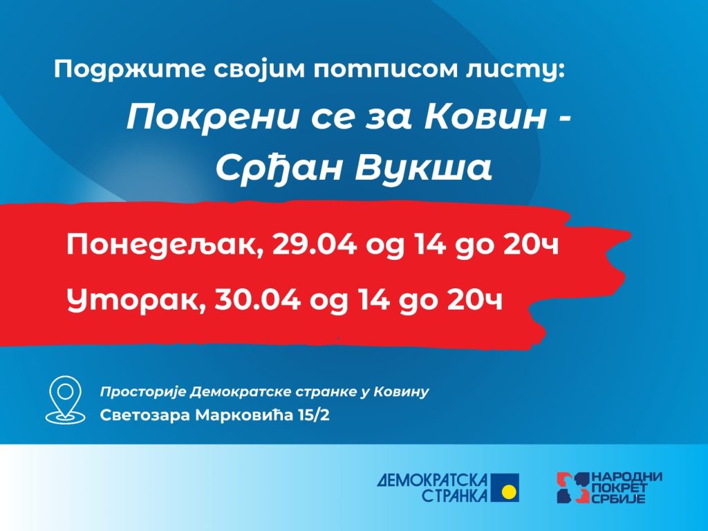 Građani kovinske opštine svoj potpis podrške koaliciji Pokreni se za Kovin – Srđan Vukša moći će da daju u ponedeljak 29. aprila i u utorak, 30. aprila od 14:00 do 20:00 časova u prostorijama Demokratske stranke.