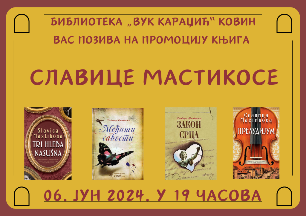 03.06.2024. – U biblioteci „Vuk Karadžić“ Kovin u četvrtak, 06. juna od 19:00 časova biće održana promocija knjiga Slavice Mastikose. Roman „Tri hleba nasušna“ kreće se od autobigrafskog preko porodičnog do društvenog romana. Postupak pripovedanja je realistički, prati prirodnu hronologiju događanja u životu porodice Mastikosa, od završetka Drugog svetskog rata do samog kraja XX veka.